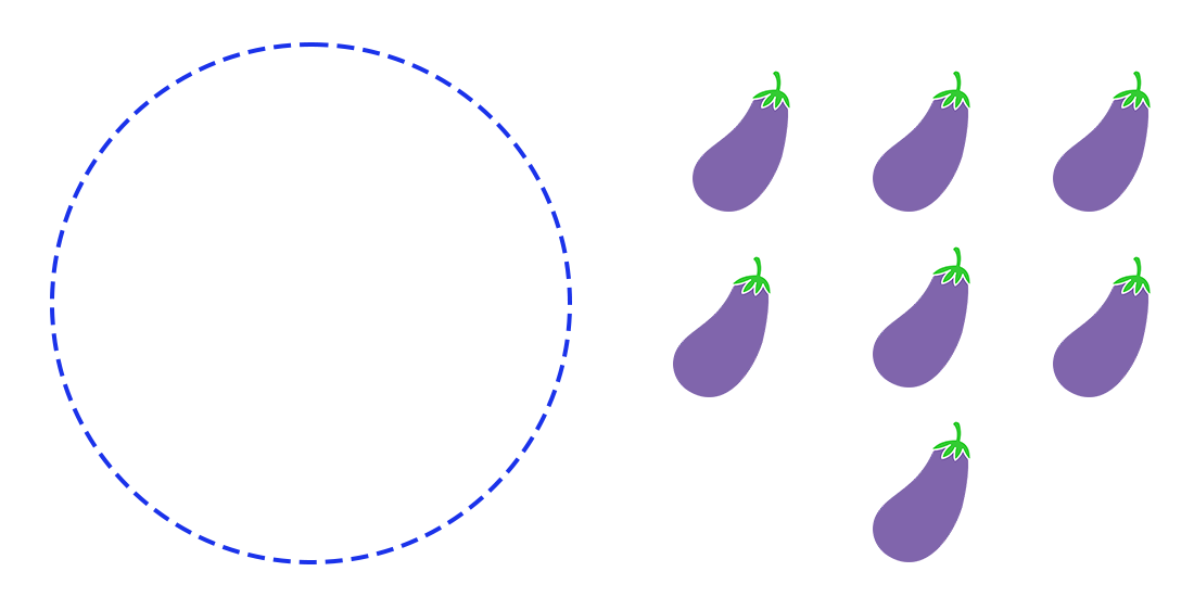 There are 0 eggplants inside the circle and 7 outside the circle. How many eggplants are there altogether?