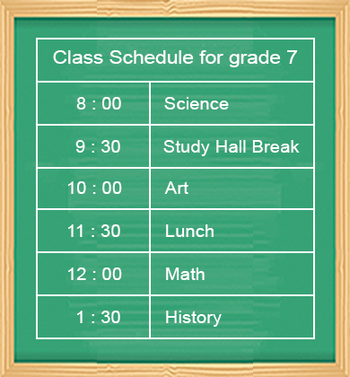 According to the school schedule, which class starts at 8:00?