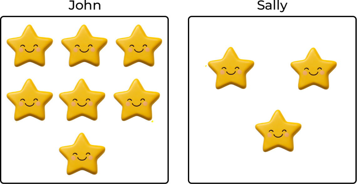 John counts 7 stars. Sally counts 3 stars. How many more stars does John count than Sally?
