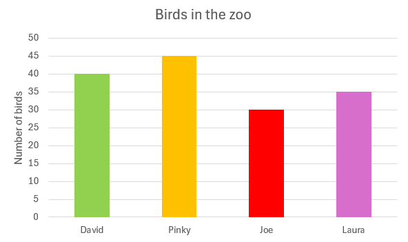 Look at the bar graph that shows the number of birds counted by David, Pinky, Joe, and Laura.