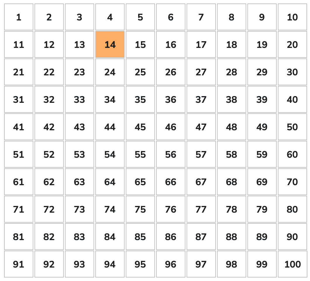 Start at 14. Move 3 rows down and 1 column to the right. What is the addition sentence and what is the sum?