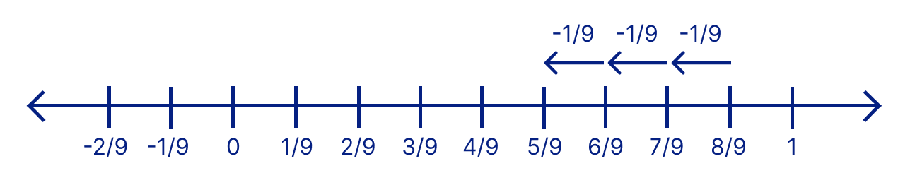 Start at 8/9 on the number line below, where the line is divided into 9 equal parts. Take 3 steps back (to the left). What fraction do you land on?