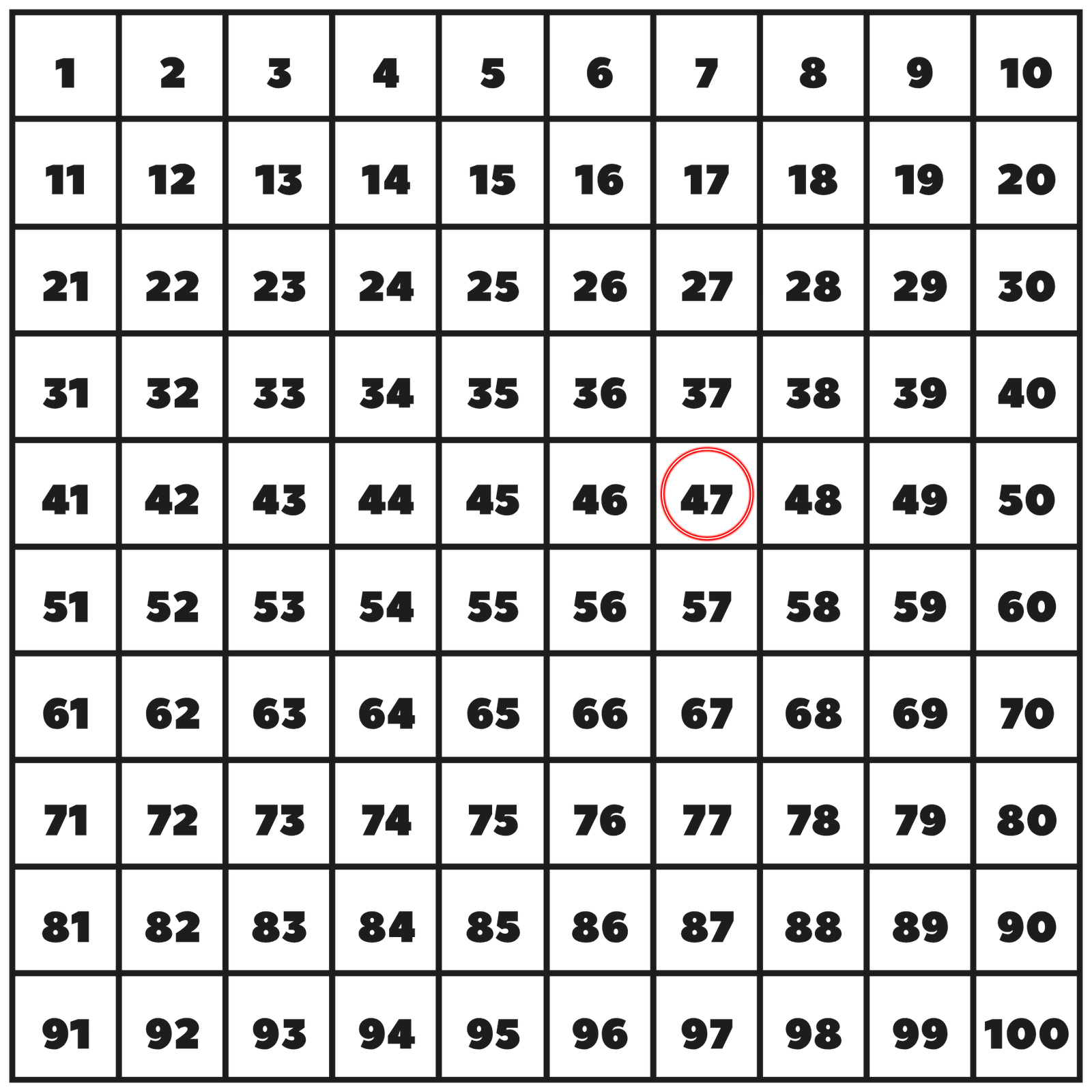 Start at 47 in the 100 table. Move 2 rows up and 5 rows to the left. What is the final outcome?