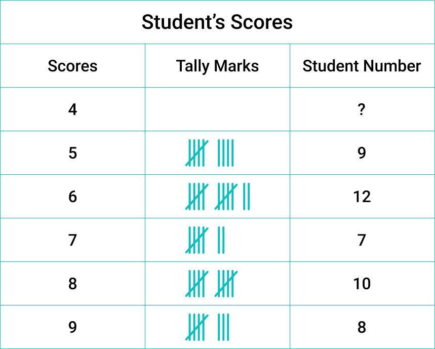 Mr. Hassan is an English teacher. He wrote down the students' exam scores in a table. If twice as many students got a score of 4 than those who got a 7, how many students got a 4? Show your answer using tally marks and numbers.